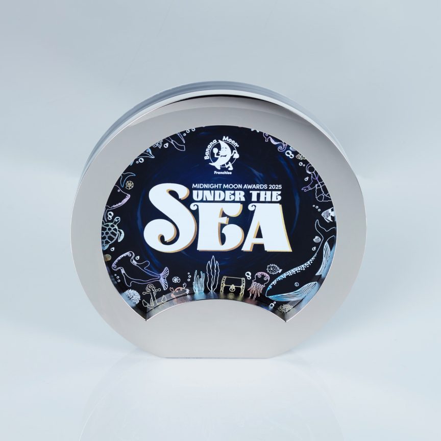 2025’s awards were inspired by the Under The Sea theme and the bubbles features throughout the event. The award was created using silver anodised and polished nickel plated aluminium engraved with the worthy winners & Banana Moon branding.  Aquatic themed digitally printed detail on the ocean blue acrylic back really takes the award to new depths!  A finish like this is perfect to reflect the strong theme of this vibrant event.