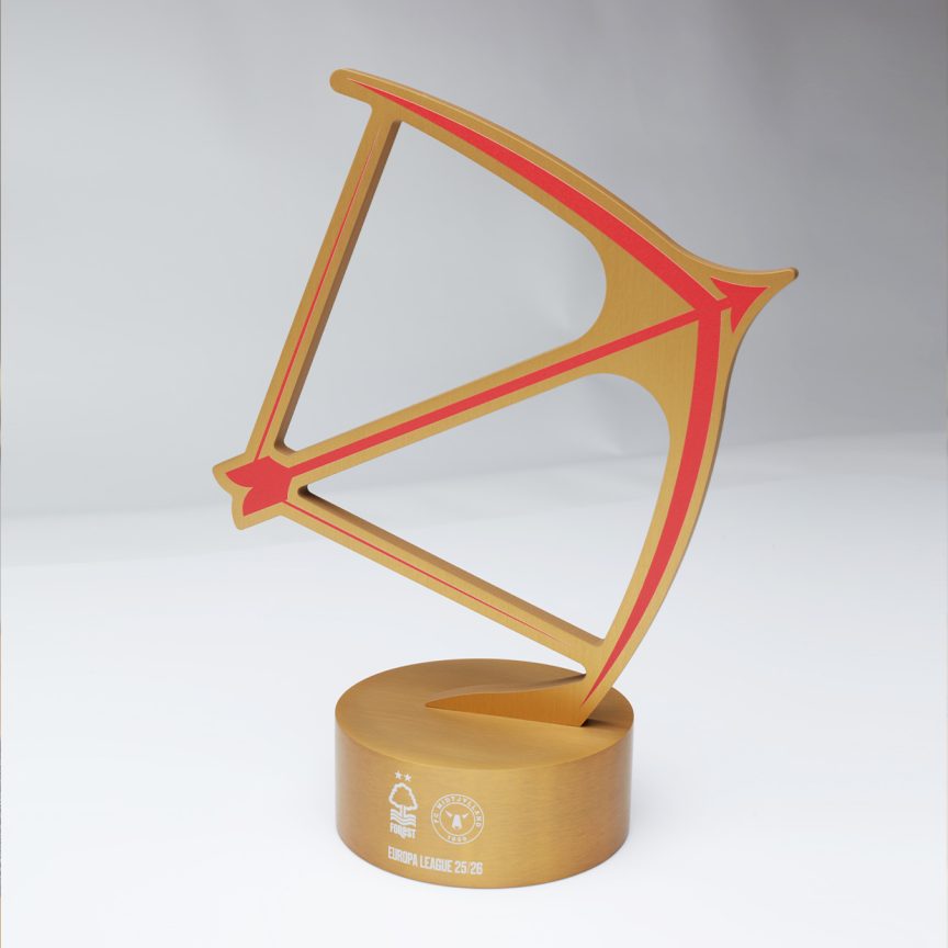 Each award has been carefully crafted to reflect the identity of Nottingham itself. With the heart of the Bow and Arrow design inspired by the iconic figure of Robin Hood, whose legacy is inseparable from Sherwood Forest and the city’s enduring spirit of courage and resilience. His bow symbolises strength, precision, and defiance – qualities that define both Nottingham and Nottingham Forest on their European journey.