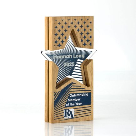 Natural wood has broad appeal, especially when responsibly sourced from certified suppliers. This range delivers on both accounts. These off-the-shelf wood awards are available in a number contemporary shapes and a choice of four woods: oak, cherry, walnut and sustainable bamboo in a warm caramel finish.