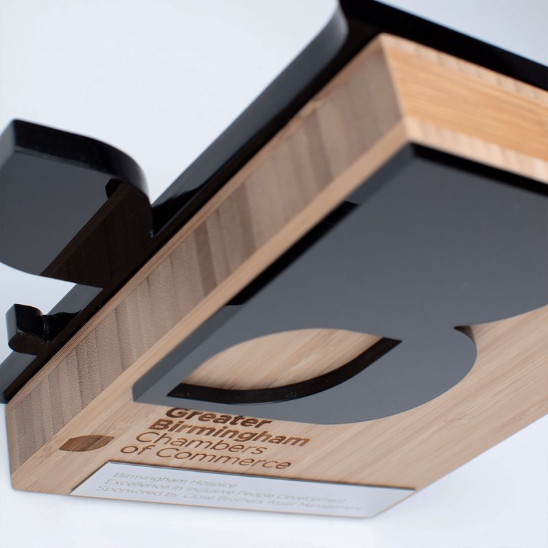 The Greater Birmingham Chambers of Commerce Award combines recycled black acrylic with a natural bamboo core, creating a striking contrast between bold, modern form and warm, sustainable material. Finished with a polished metal plate and precision laser-engraved detailing, the design delivers a refined, contemporary aesthetic that reflects both innovation and heritage.