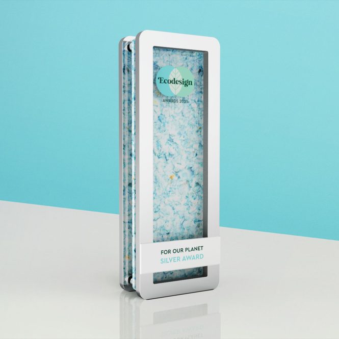 Encapsulating a piece of 100% recycled plastic, this section is suspended between two recycled aluminium rectangles to give the illusion of floating. Personalised using digital printing on the front of the clear acrylic and recycled white acrylic section.