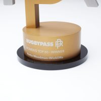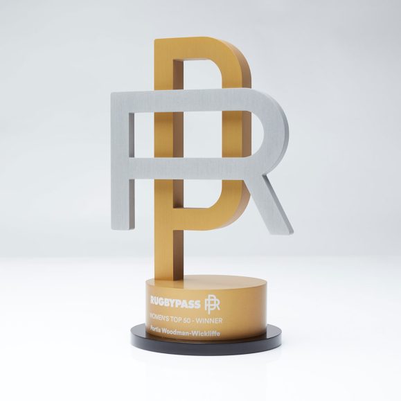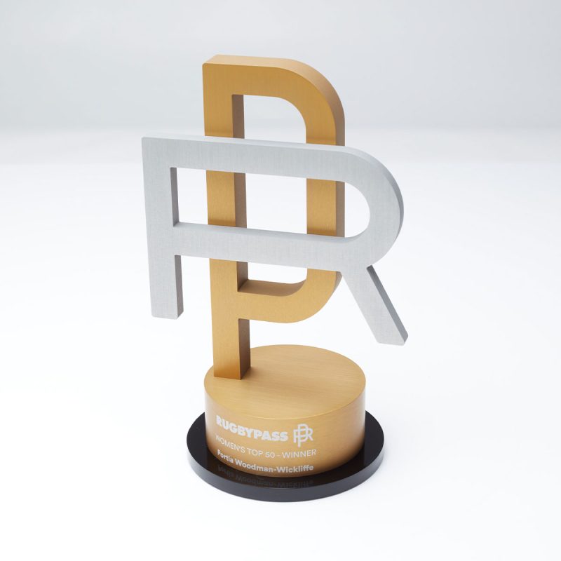 The RugbyPass Women’s Top 50 Award features a bold, layered monogram crafted from gold and silver anodised aluminium, creating a striking contrast that reflects prestige and modernity. Finished with precision laser engraving and mounted on a gold-finish base with a black acrylic foot, the piece delivers a refined, contemporary aesthetic worthy of celebrating the game’s top athletes.